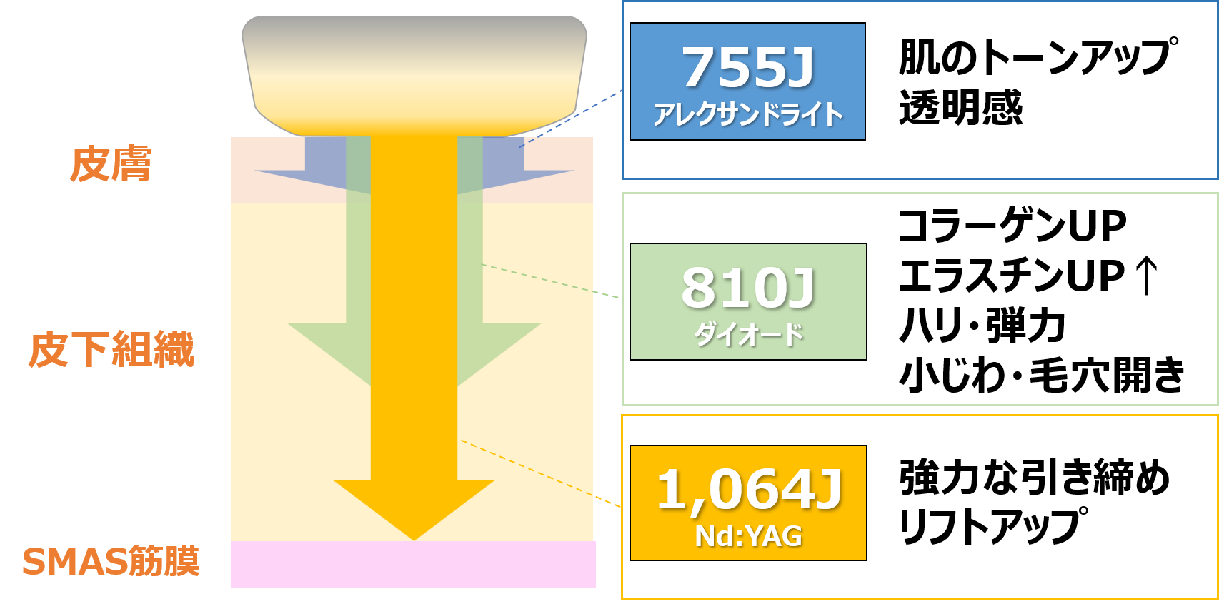 ソプラノチタニウムというレーザーは、1回照射すると3波長のレーザーを同時に出力します。