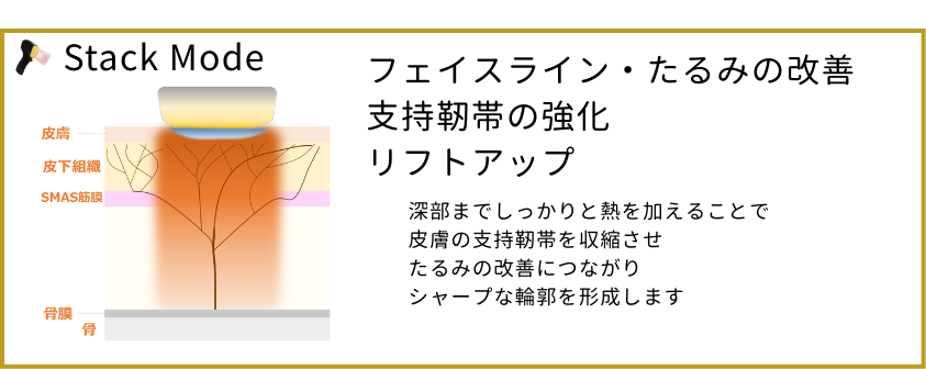 コラーゲン繊維の熱変性による即時効果に加えて 線維芽細胞の活性化によるコラーゲン・エラスチン生成により施術後2~3か月かけて さらなるリフトアップ効果が期待できます