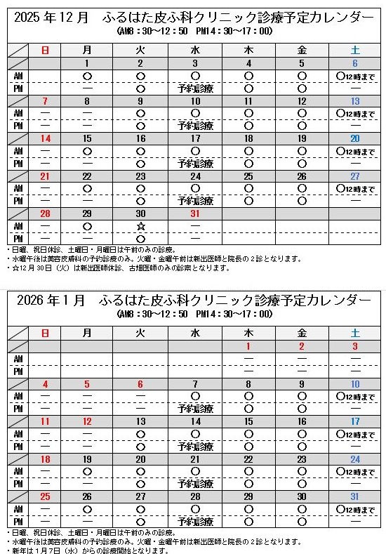 水曜午後は、美容皮膚科の予約診療のみとなります