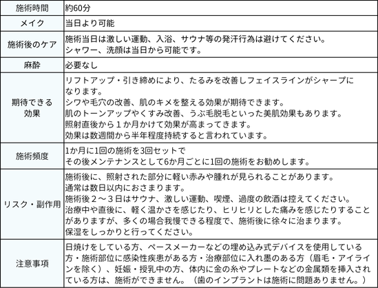 コラーゲン繊維の熱変性による即時効果に加えて 線維芽細胞の活性化によるコラーゲン・エラスチン生成により施術後2~3か月かけて さらなるリフトアップ効果が期待できます